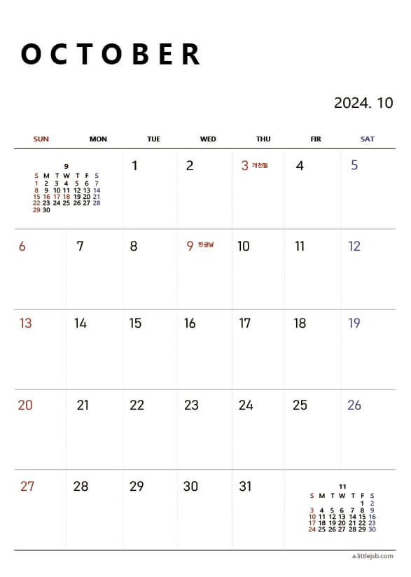 10월은 공휴일이 개천절, 한글날 2일입니다.