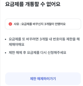 알뜰폰 요금제로 쓴 지 2달이 넘어가면서 통화와 문자가 부족해 요금제를 바꾸려니 요금제를 3개월 이상 써야 바꿀 수 있더라고요. '내 번호 이동 제한을 해제' 한 후에 신청을 할 수 있다고 나와